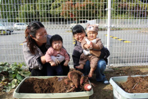 10月14日 子育て支援センターにおいて、さつまいも堀りを行いました。残念ながらくもり後小雨のお天気…