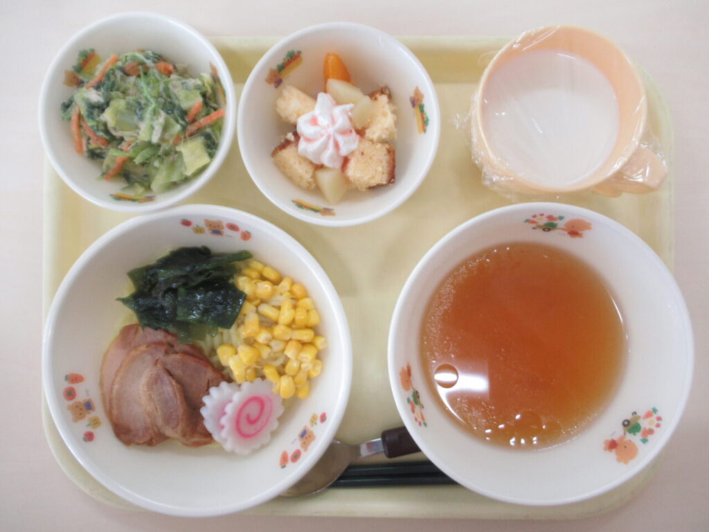 醤油ラーメン 胡麻マヨネーズ和え 牛乳 ミニパフェ