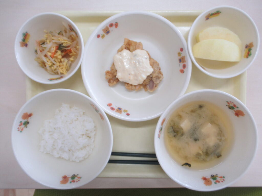ごはん チキン南蛮 もやしの中華和え みそ汁 りんご