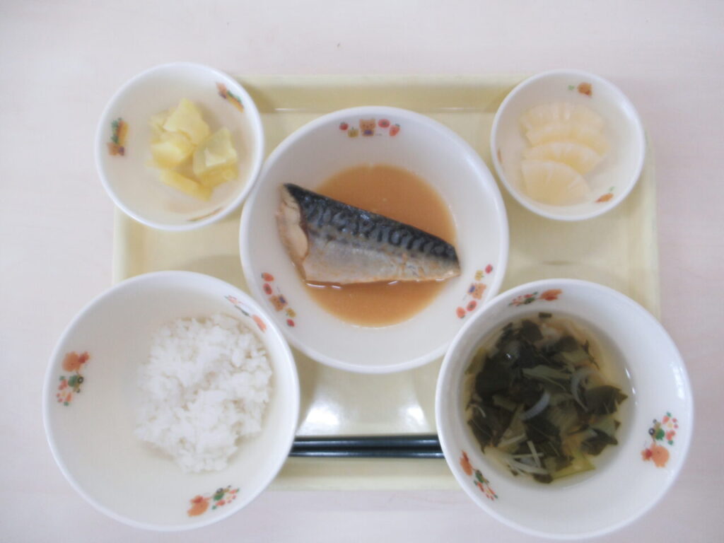 サバの味噌煮、さつま芋のレモン煮、ごはん、すまし汁、パイン