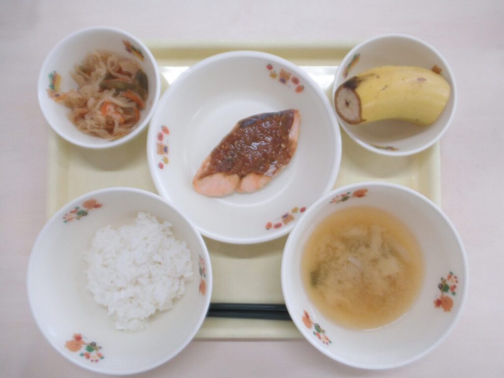 ごはん 鮭のごまみそ焼き 切り干し大根の煮物 みそ汁 バナナ