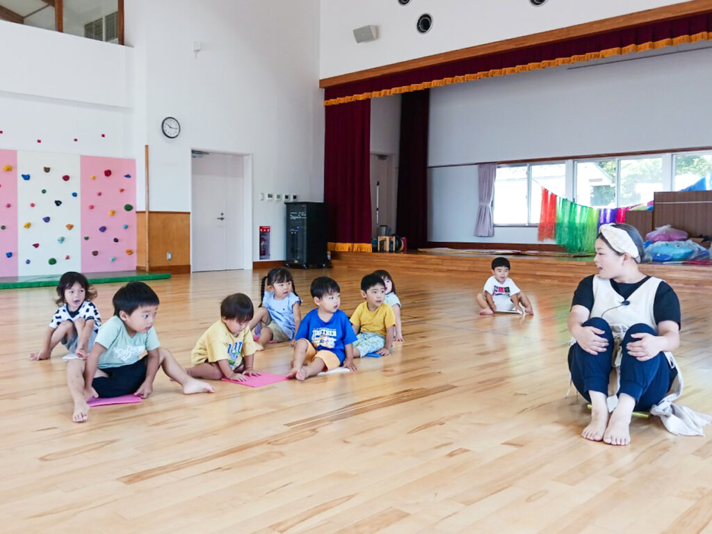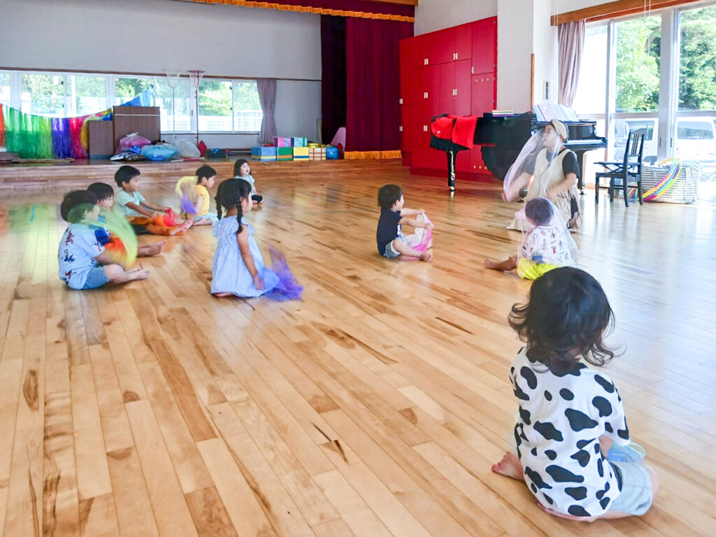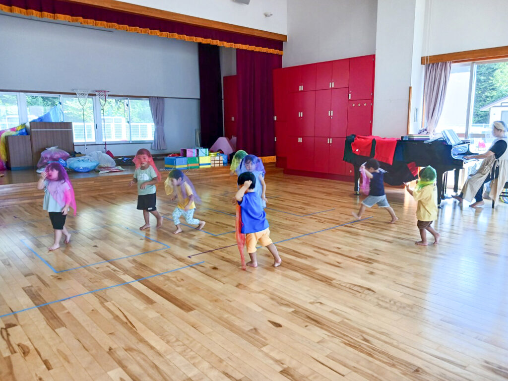 いろいろな動物になりきって自由に体を動かしたり、ピアノの音を聴いてボードやオーガンジー・ボールなどを使ったリズムあそびをして楽しい時間を過ごしました。