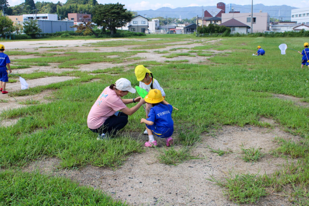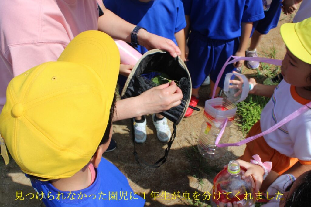 駐車場脇の広場で1年生とペアになり、優しく声をかけてもらいながら虫探しをしたり、捕まえた虫を一緒に観察したりと、とても楽しそうに過ごしていました。
