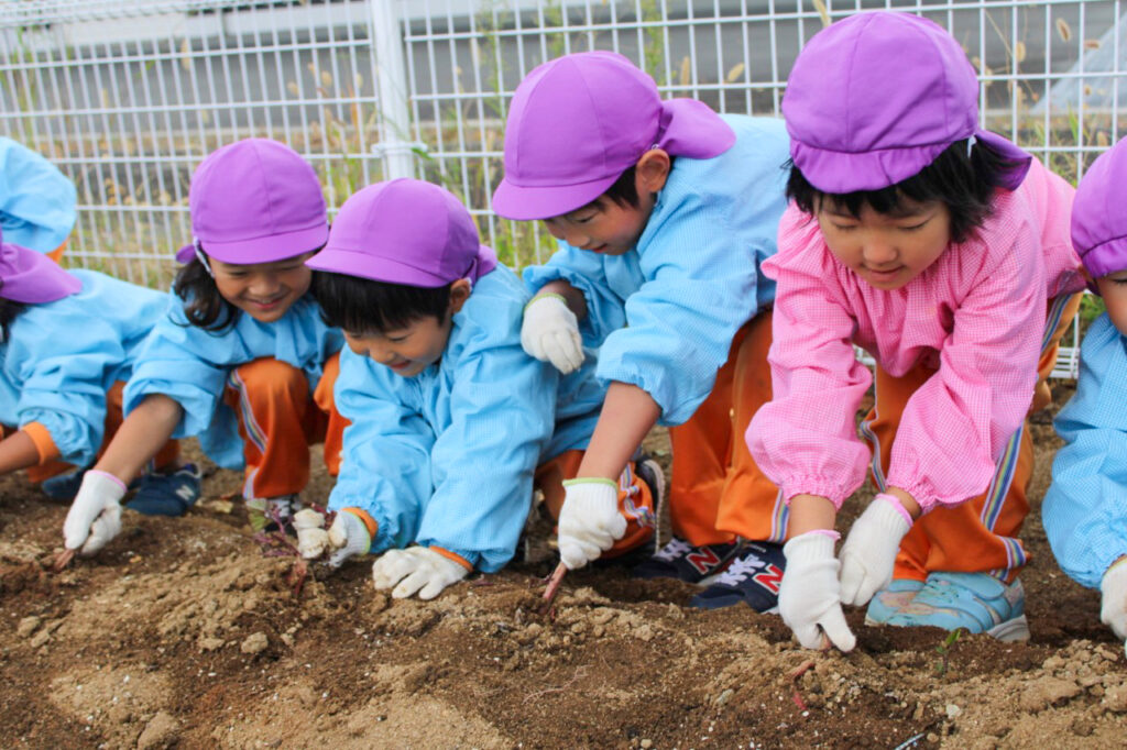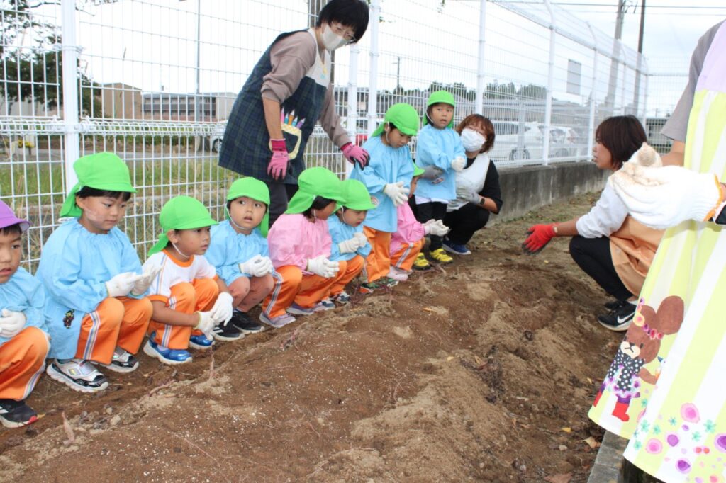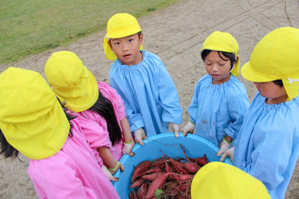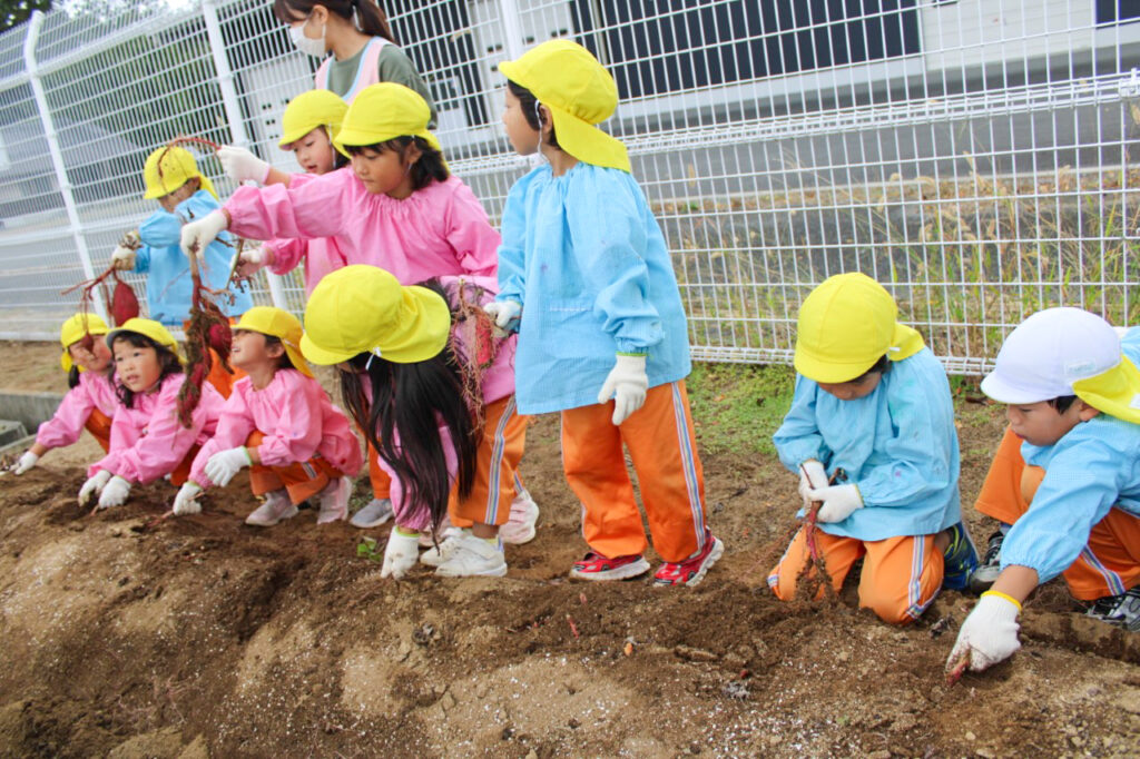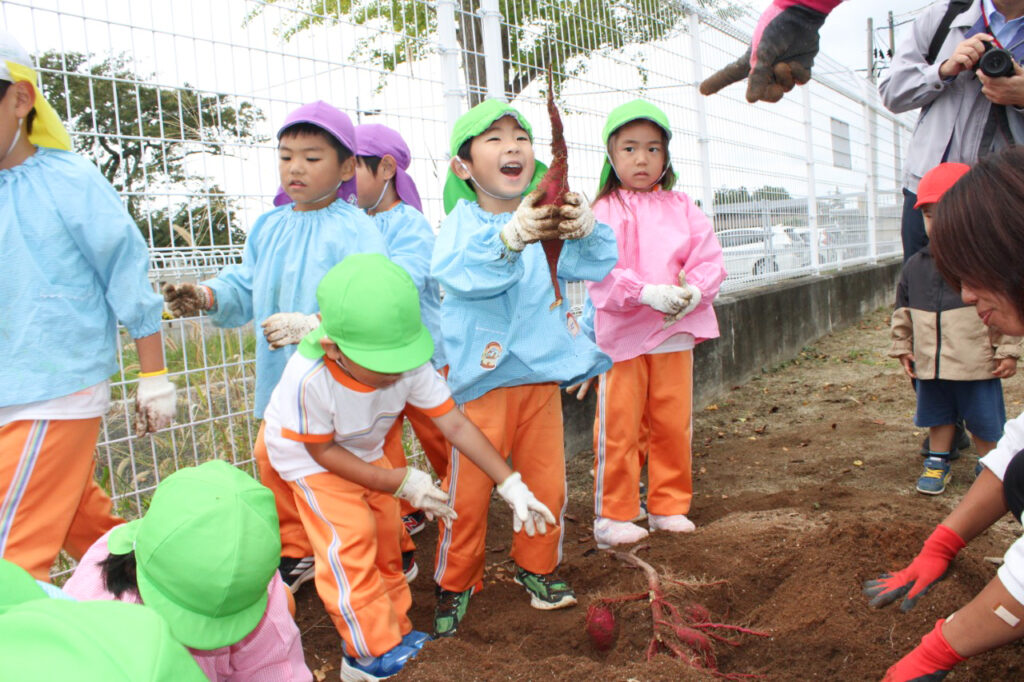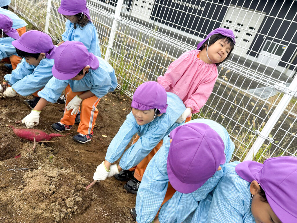 目をキラキラさせながら、さつまいも掘りを楽しんでいました。なかなか抜けないさつまいもは友だちと「うんとこしょ!どっこいしょ!」と言いながら頑張って引っ張っていました。