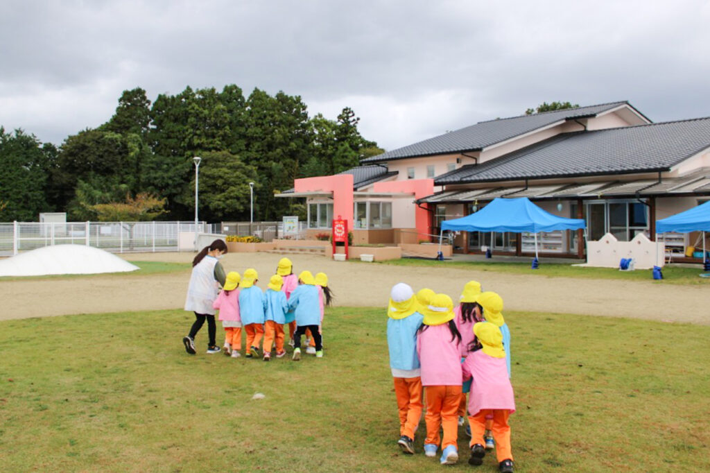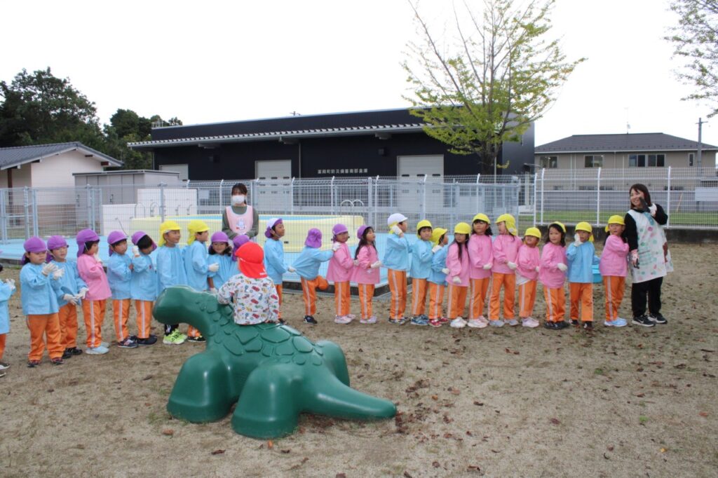 軍手をはめて、さつまいも列車で出発!プール脇のさつまいも畑に到着し、「いっぱいとるぞ!」「大きいのとるぞ!」と意気込む子どもたち。