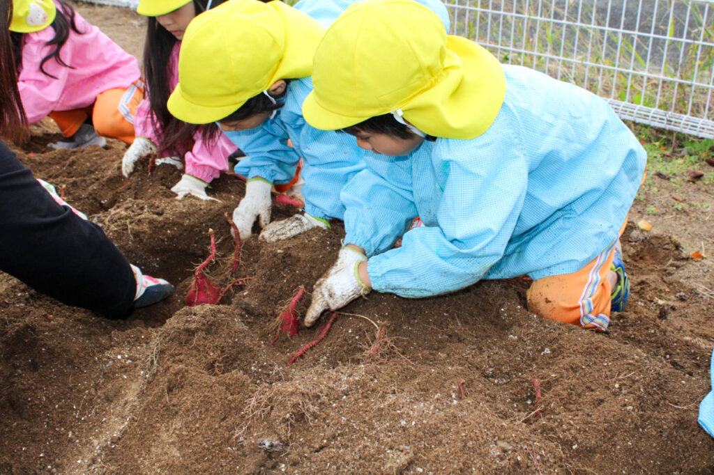 目をキラキラさせながら、さつまいも掘りを楽しんでいました。なかなか抜けないさつまいもは友だちと「うんとこしょ!どっこいしょ!」と言いながら頑張って引っ張っていました。
