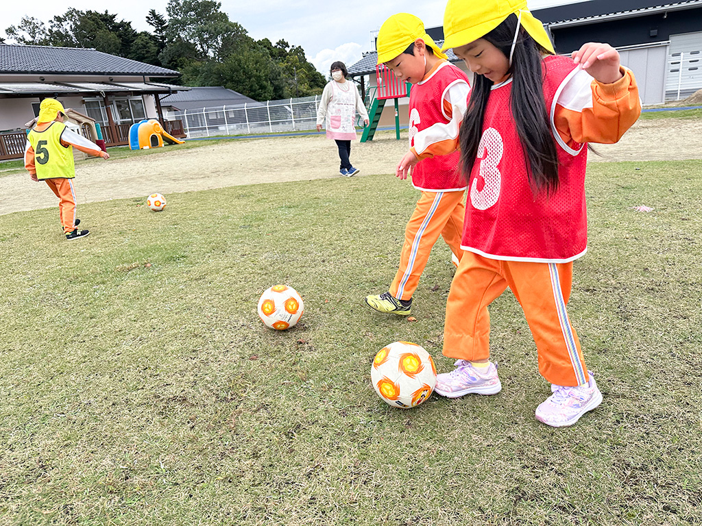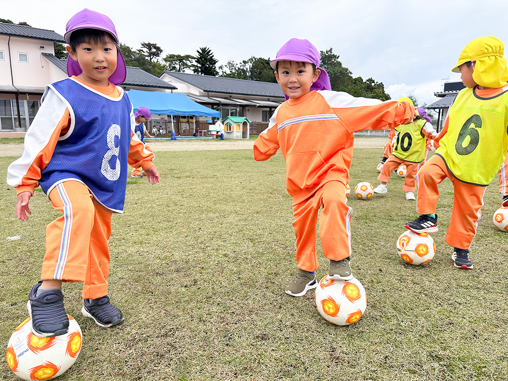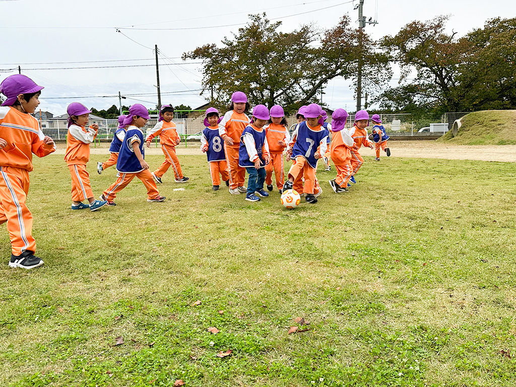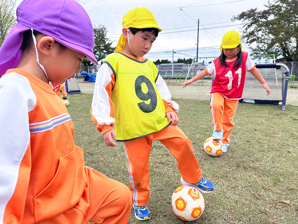 10月22日にサッカー教室があり、5歳児さくら組・4歳児もも組の園児が参加しました。少しずつボールに慣れていけるようボールをキャッチしたり、ボールを蹴る、足でボールをとめる、ボールを蹴りながら歩く練習などをした後に、各クラス2チームに分かれて試合をしました。一生懸命ボールを追いかける姿がとってもかっこいい子どもたちでした!