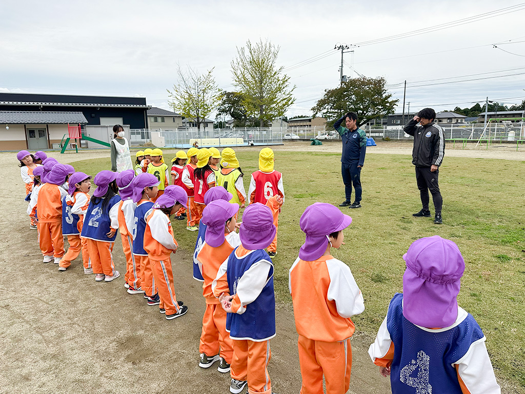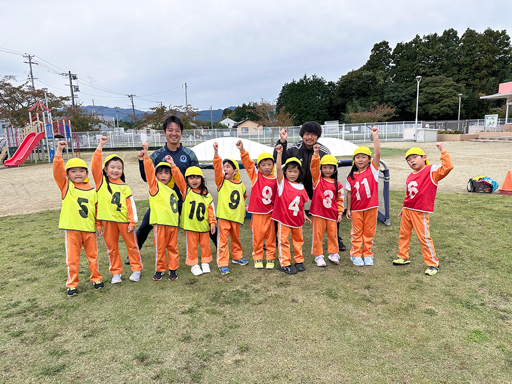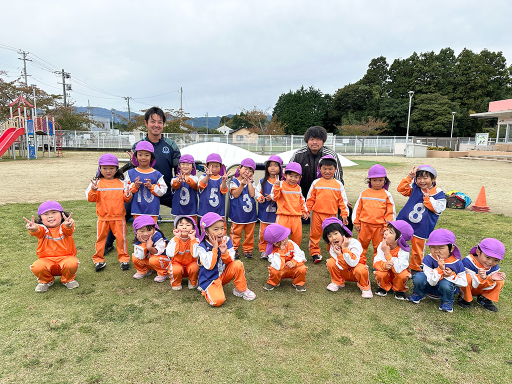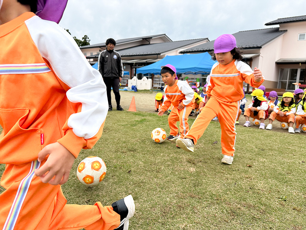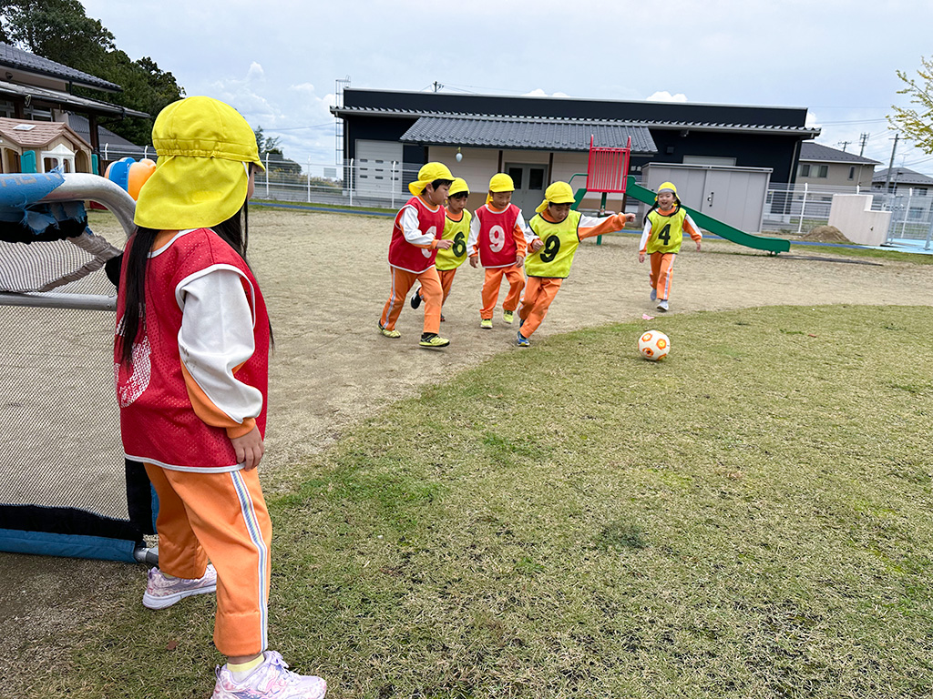 10月22日にサッカー教室があり、5歳児さくら組・4歳児もも組の園児が参加しました。少しずつボールに慣れていけるようボールをキャッチしたり、ボールを蹴る、足でボールをとめる、ボールを蹴りながら歩く練習などをした後に、各クラス2チームに分かれて試合をしました。一生懸命ボールを追いかける姿がとってもかっこいい子どもたちでした!