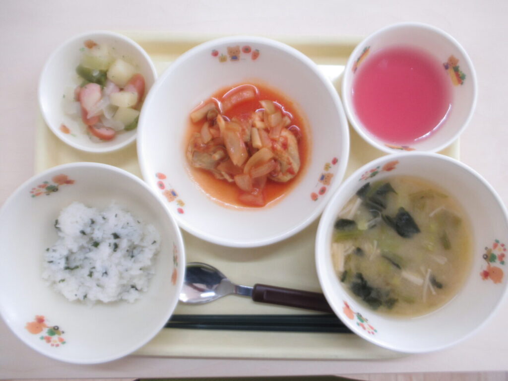 わかめごはん 鶏肉のオニオントマト煮 ジャーマンポテト みそ汁 フルーツゼリー