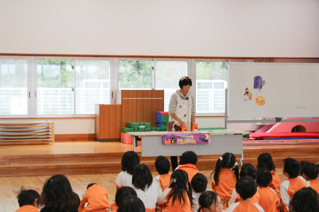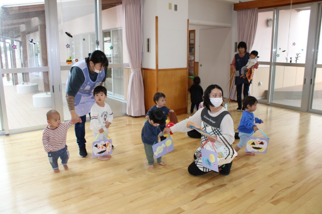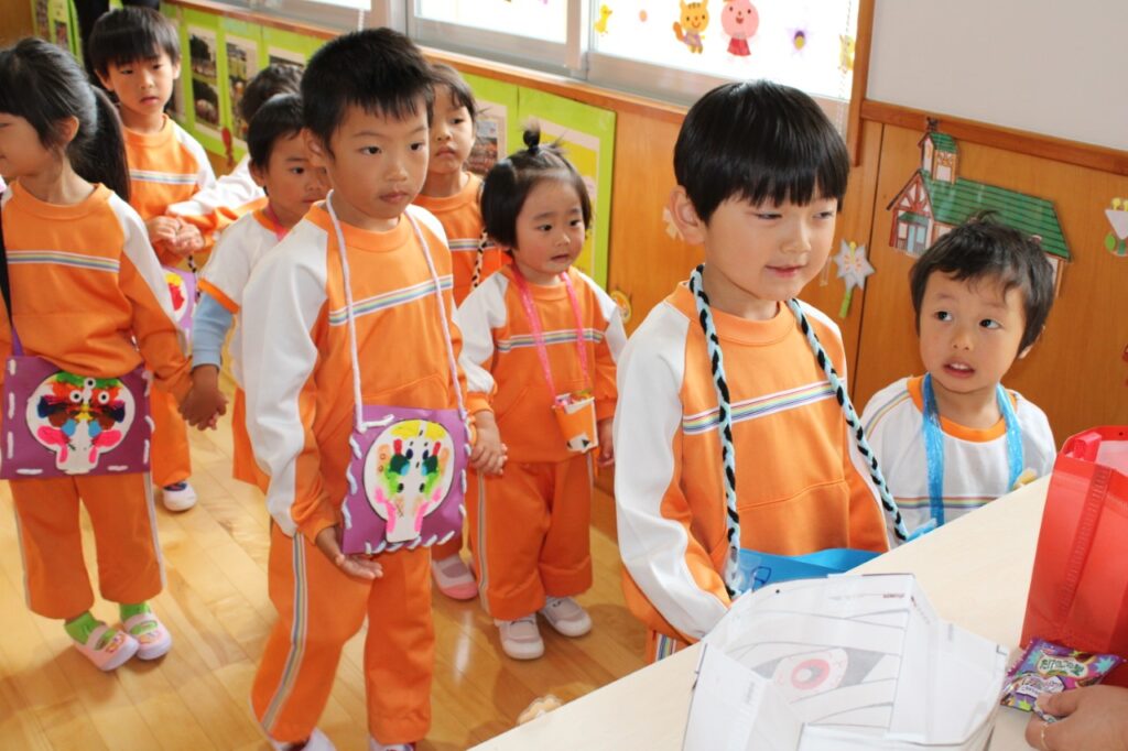 10月31日、ハロウィンの日、こども園がまるごと冒険のステージに!「トリックオアトリート お菓子くれなきゃいたずらするぞ」と意気込みながら、子ども達は園中を探検。魔女などに変身した先生方から次々とお菓子をゲットする子ども達でした。