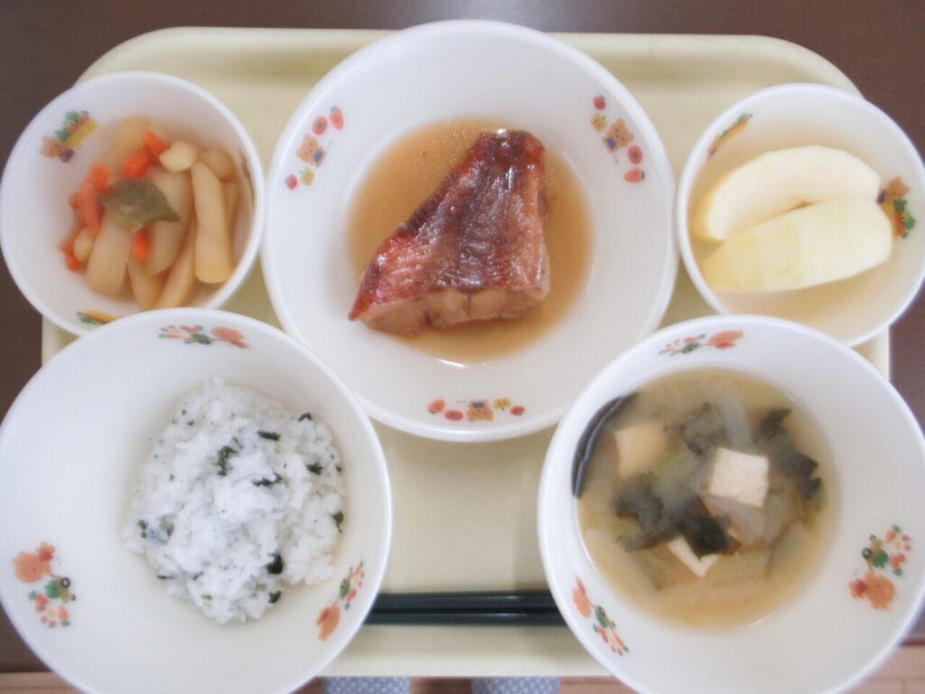 わかめごはん 煮魚 じゃがいもの金平 みそ汁 りんご