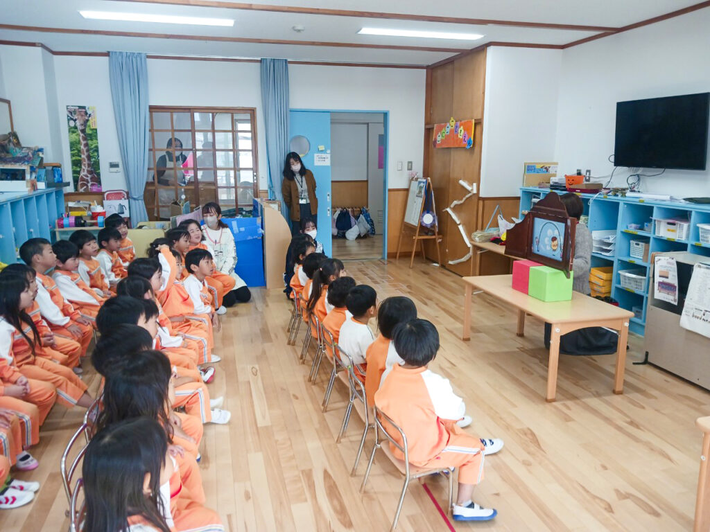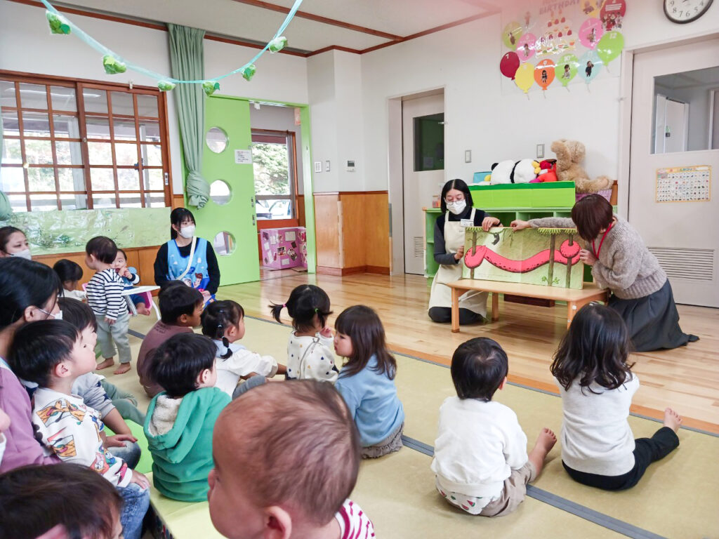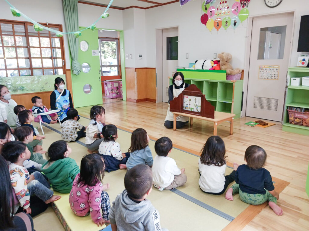 子育て支援センター、一時預かり、未満児クラス、以上児クラスで時間を分けて行っているため、年齢によって違う絵本を読んでくれます。 紙芝居に大型絵本、様々な絵本を楽しみました。次回はどんな絵本を持ってきてくれるかな?