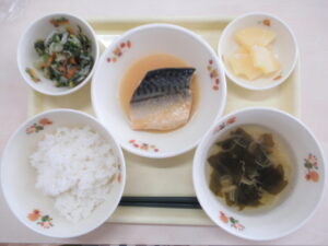 ごはん さばのみそ煮 野菜の磯和え すまし汁 パイン缶