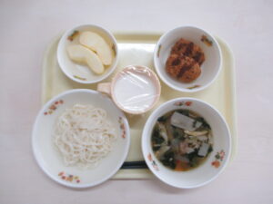 肉うどん、かぼちゃコロッケ、牛乳、りんご
