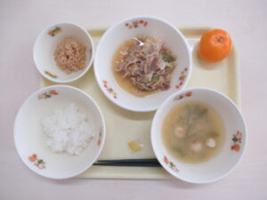 すき焼き風、納豆、ごはん、みそ汁、みかん
