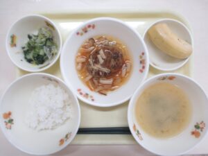ごはん きのこのあんかけハンバーグ しらす和え みそ汁 バナナ