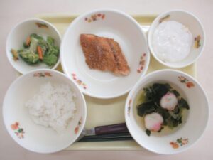 白身魚のピカタ、さつま芋サラダ、わかめごはん、みそ汁、オレンジ
