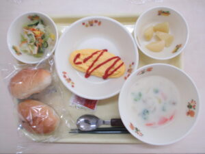 バターロール オムレツ フレンチサラダ クリームシチュー 白桃缶 いちごジャム
