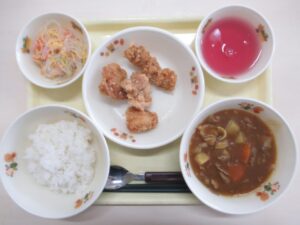 ちゅうりっぷぐみリクエストメニュー ポークカレー 鶏のから揚げ 春雨サラダ フルーツゼリー