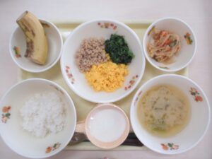 三色丼 切り干し大根の煮物 みそ汁 バナナ 牛乳