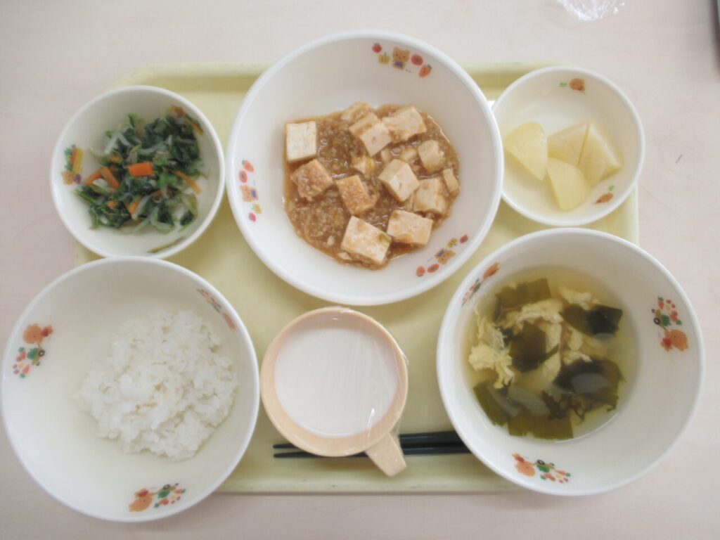 ごはん 麻婆豆腐 ナムル わかめスープ 白桃缶 牛乳