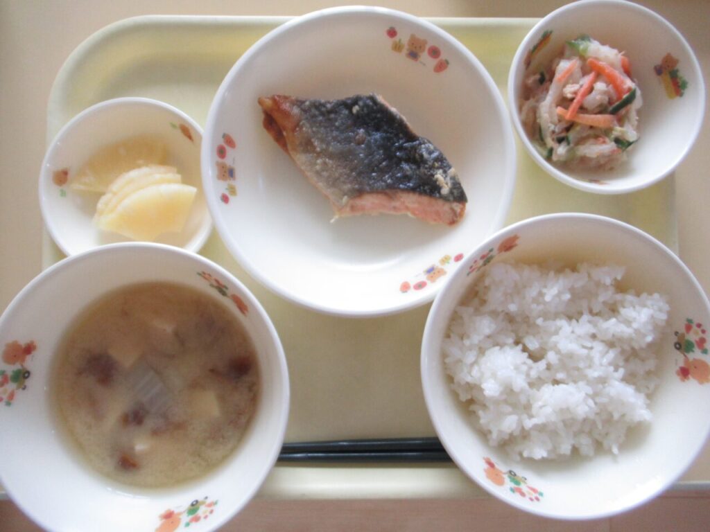 ごはん 鮭のムニエル 大根サラダ みそ汁 パイン缶