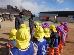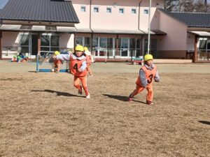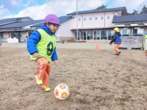1月21日に今年度最後のサッカー教室があり、5歳児さくらぐみ、4歳児もも組の子ども達が参加しました。