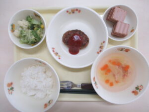 ごはん ハンバーグ ブロッコリーのサラダ コンソメスープ ケーキ