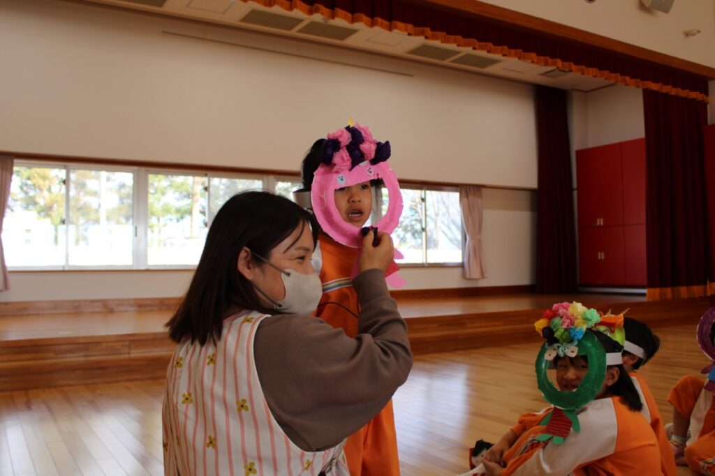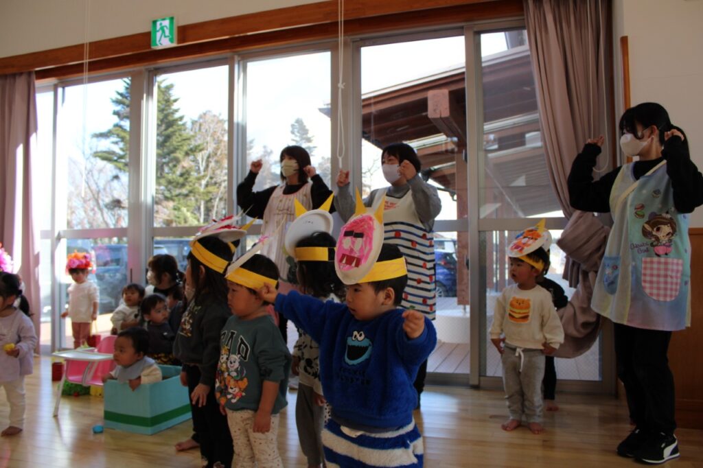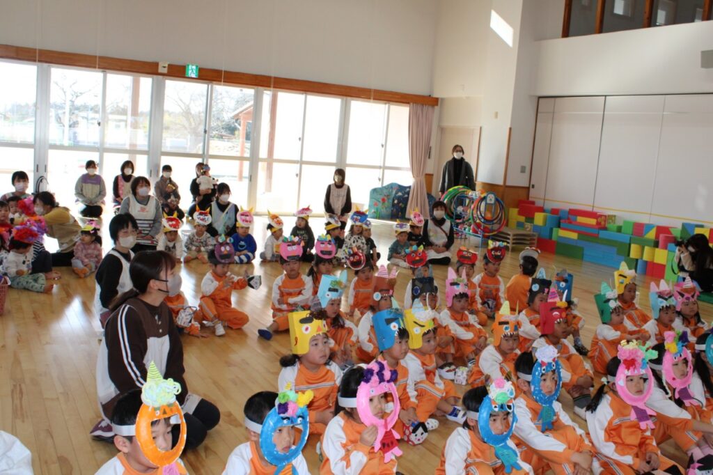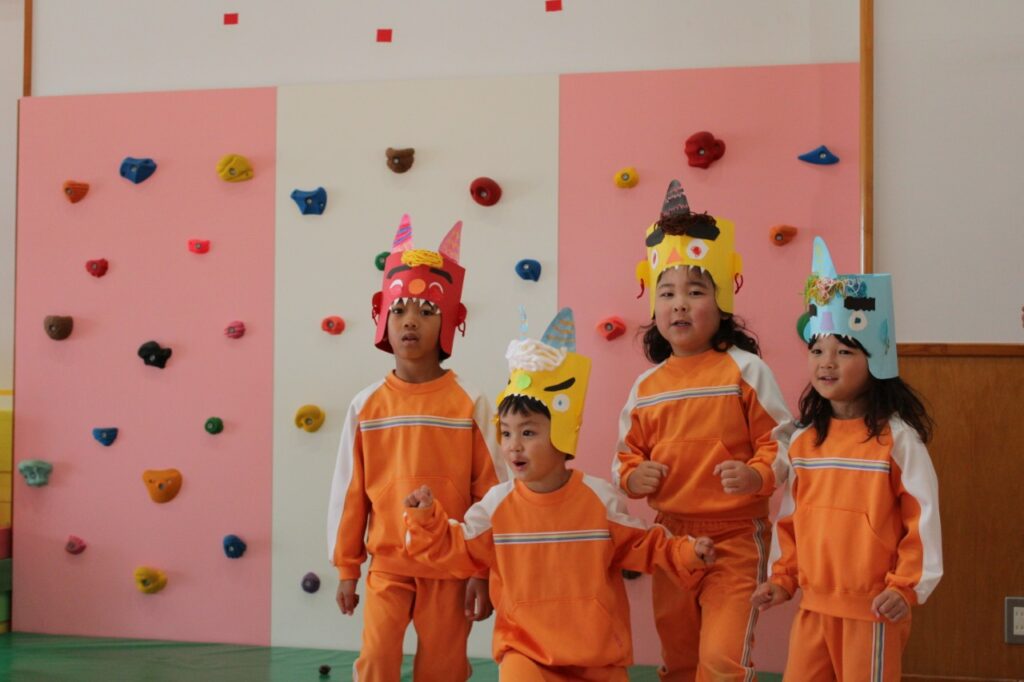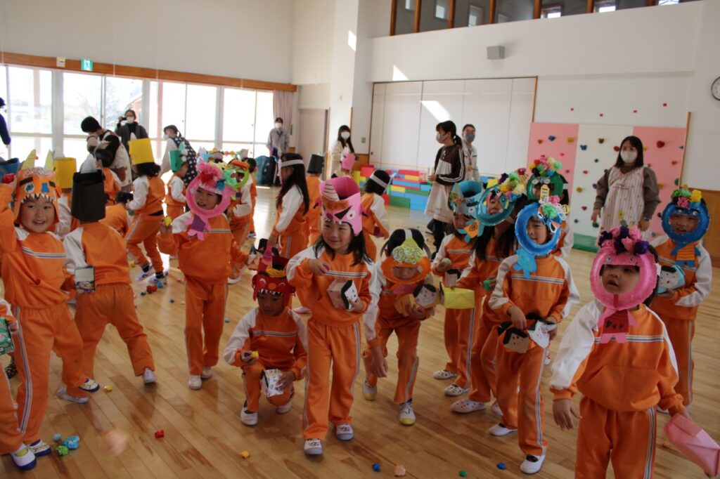2月3日は節分!こども園でも豆まき会を行いました。子どもたちは自分で作った色とりどりの鬼のお面をかぶり、年齢ごとの個性あふれるかわいらしい鬼になって集まりました。由来のお話を真剣に聞き、自分の心の中の鬼を聞かれると「泣き虫鬼」「怒りんぼ鬼」などと答えていました。『豆まき』の歌を元気にうたって、心の中の鬼をやっつけました!