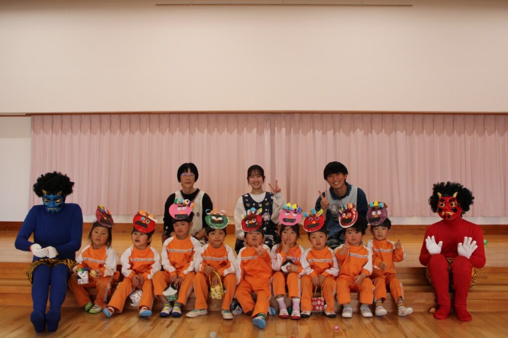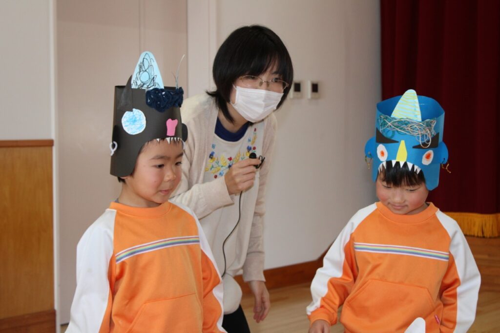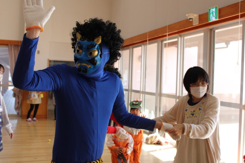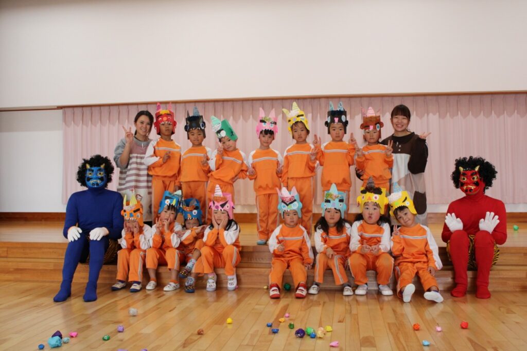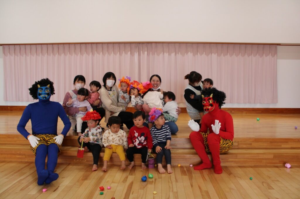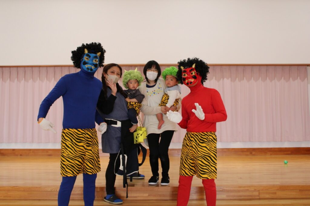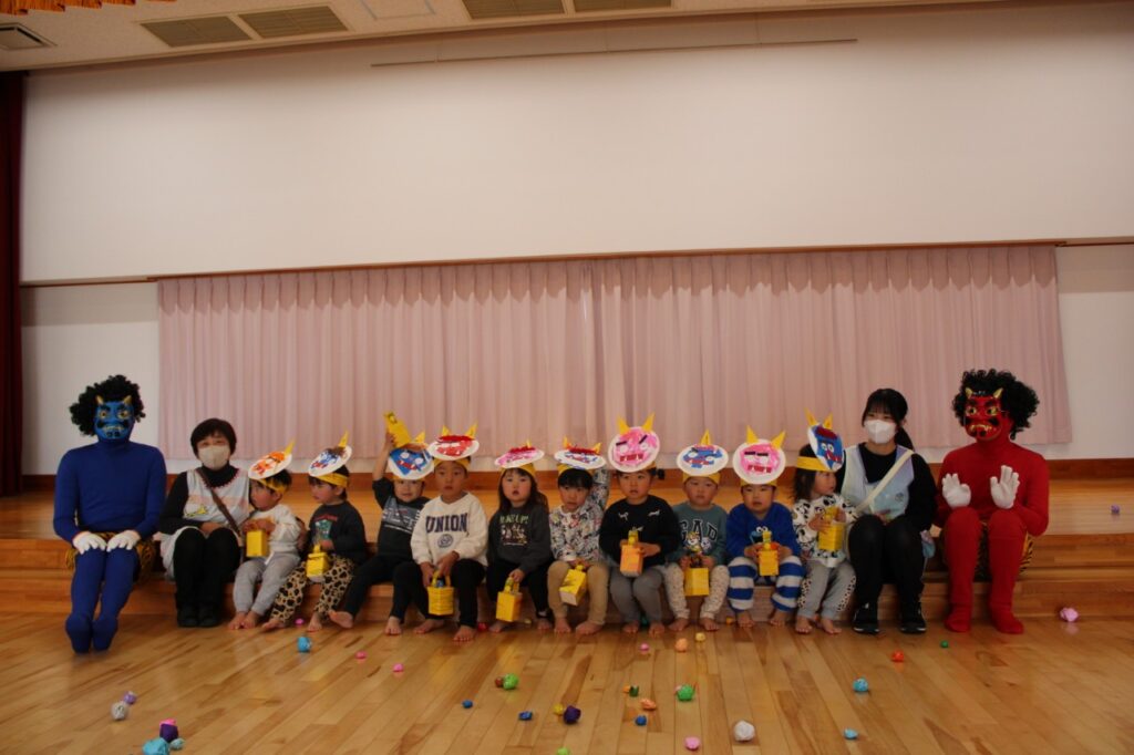 その後はいよいよ鬼の登場。ドキドキしながら待つ子どもたちでしたが、今年の鬼は恥ずかしがり屋さん。みんなで「おいで~」と呼んで迎え入れました。優しい鬼でよかったね!