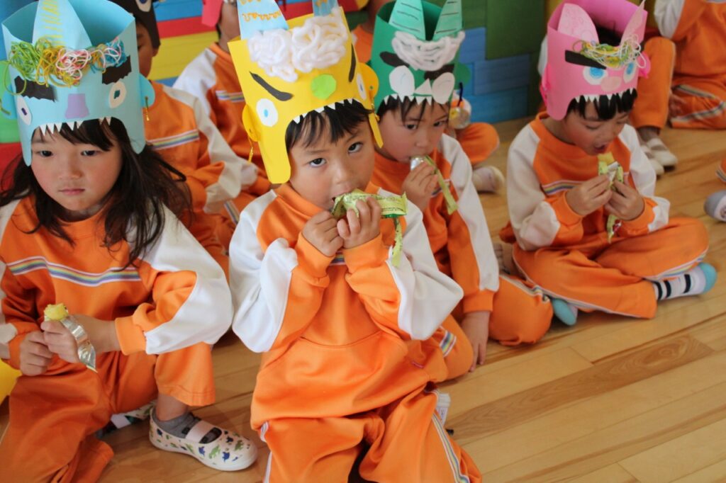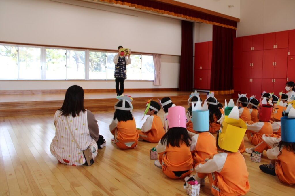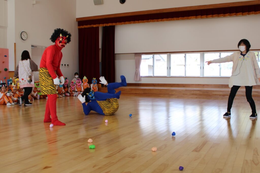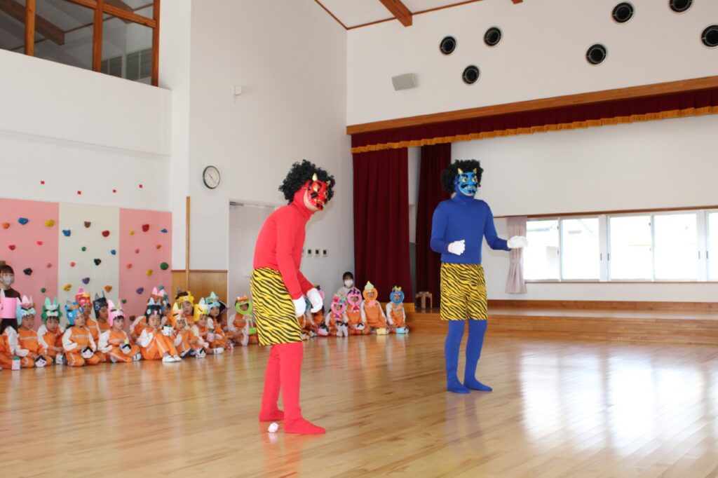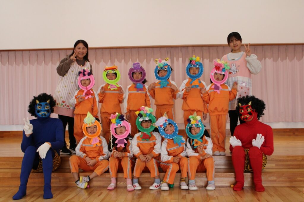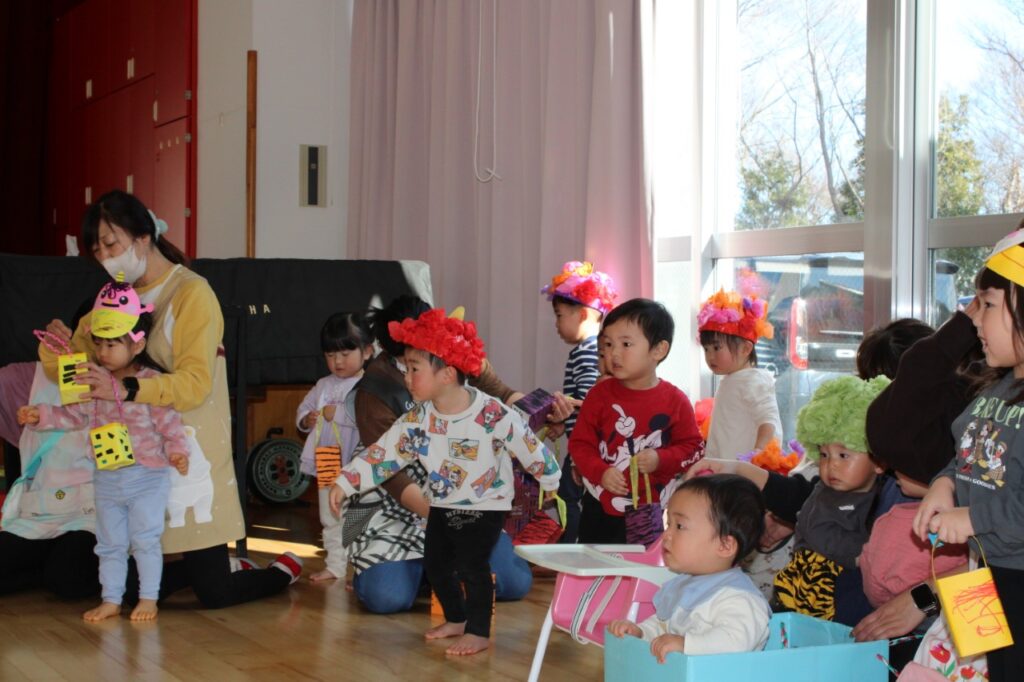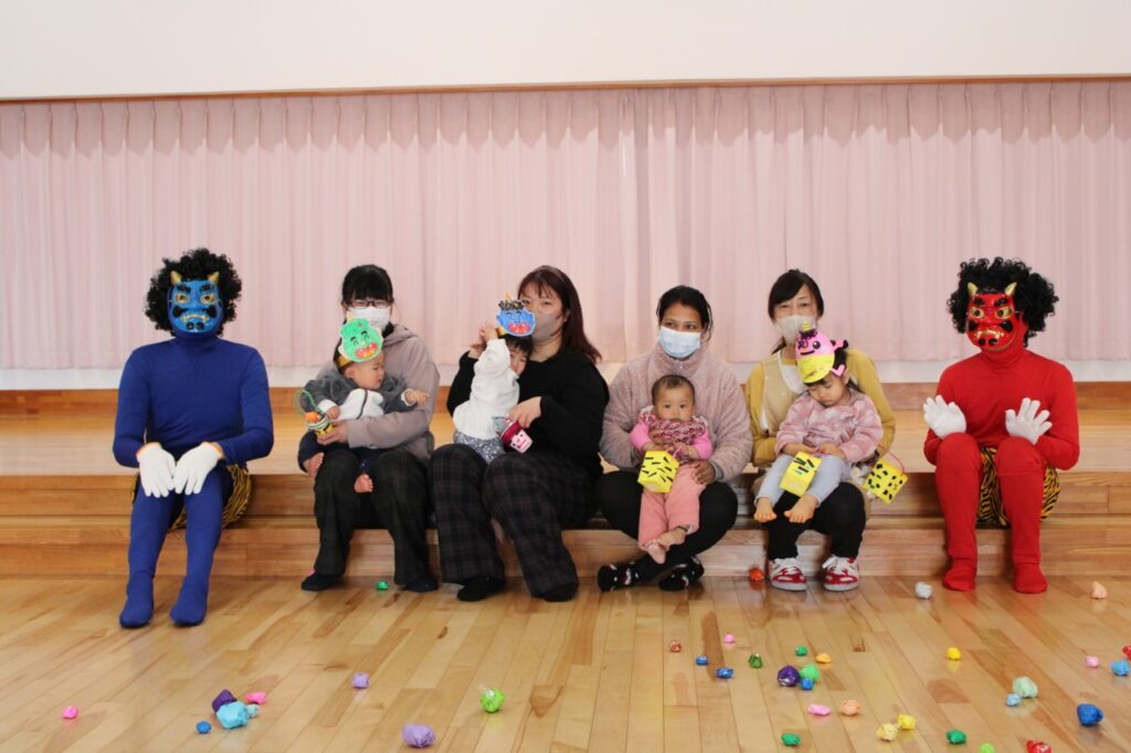 その後はいよいよ鬼の登場。ドキドキしながら待つ子どもたちでしたが、今年の鬼は恥ずかしがり屋さん。みんなで「おいで~」と呼んで迎え入れました。優しい鬼でよかったね!
