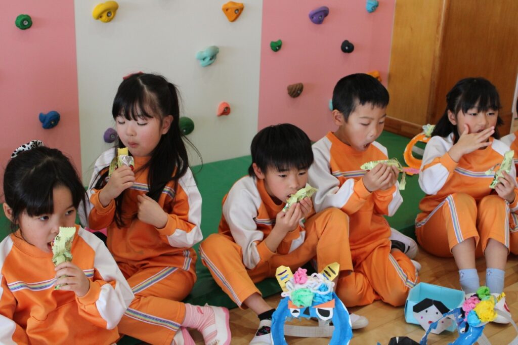 豆まきをして、『鬼のパンツ』を一緒に踊って、写真を撮って最後は仲良しになって帰っていきました。 3,4,5歳児は福が来ることを願って、恵方巻(うまい棒)を食べました。今年の恵方は南南東。子どもたちが健康に過ごせますように・・・。職員一同願っています!