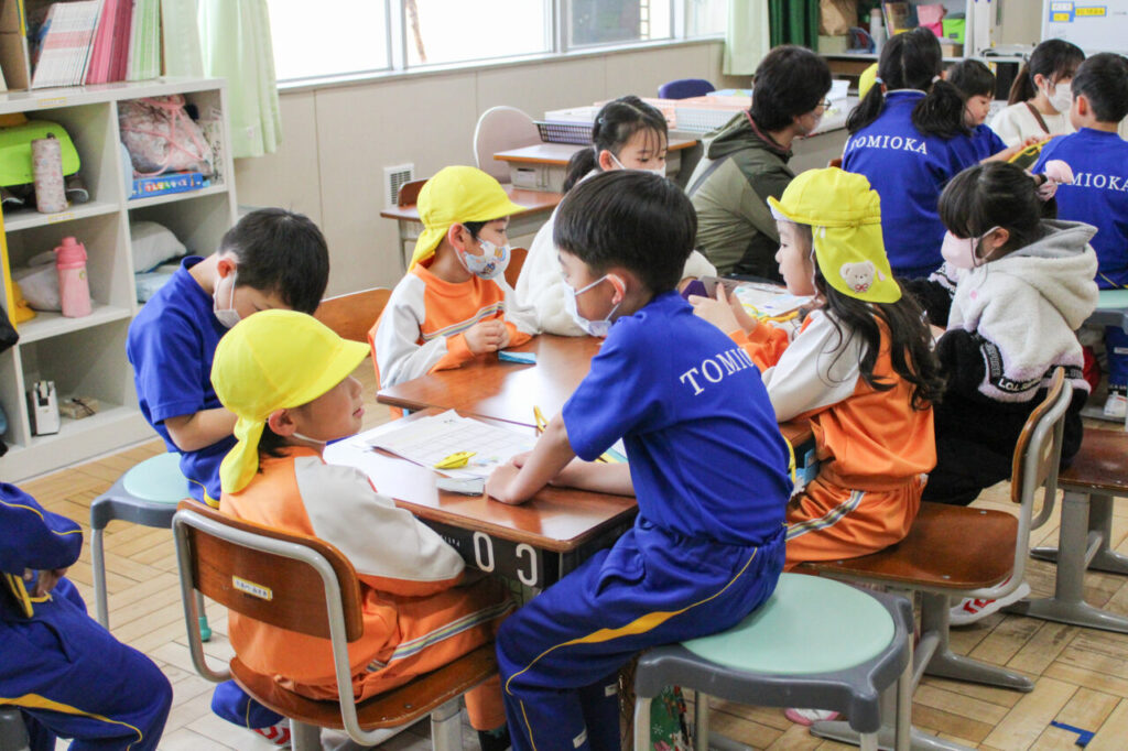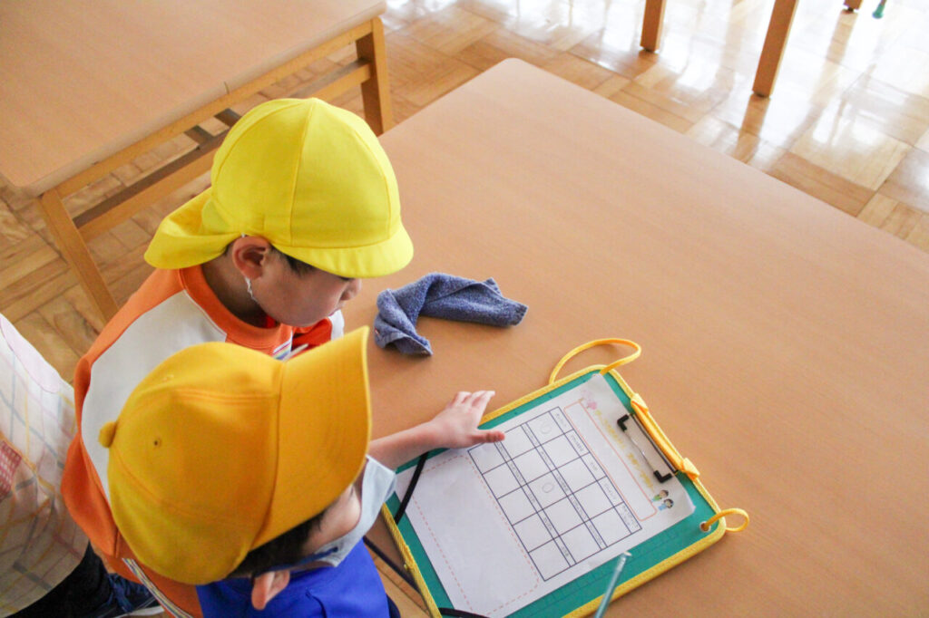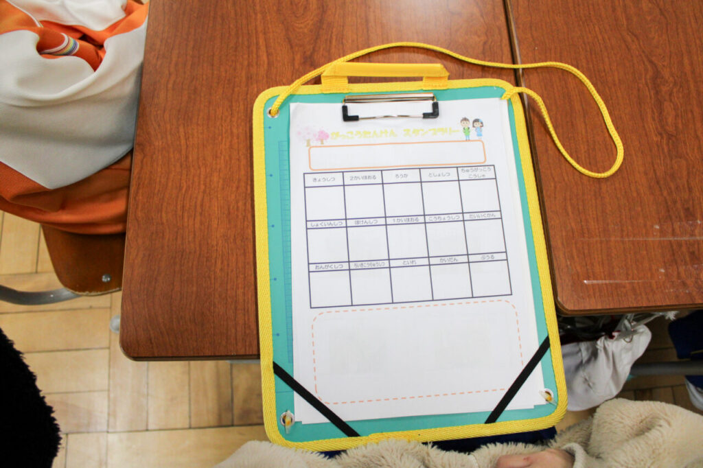 1年生のお兄さん、お姉さんと一緒に校内を散策しながら、いろいろな教室を探検しました。全部まわると、1年生が作ったお手製のシールがもらえるご褒美もありました。シールを貼ってもらった子どもたちは、にこにこ笑顔で「ありがとう」とお礼をしていました。