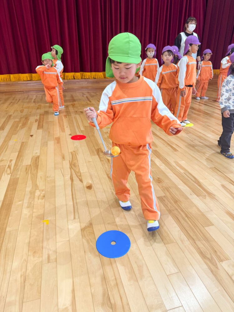 最後はお玉リレー!ピンポン玉を乗せたお玉を、体のバランスがとれるとのことで利き手と逆の手で持ち、リレーをしました。子どもたちはピンポン玉が落ちないように慎重に運んでいました。 さくらスポーツの皆さん、1年間ありがとうございました。