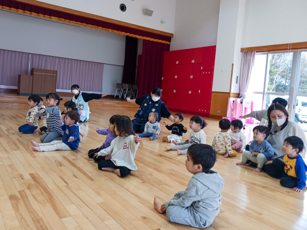 たんぽぽ組は初めて参加をしたからか、はじめは不思議そうに見ていましたが、ちゅうりっぷ組の真似をして少しずつ体を動かすなど楽しむ姿が見受けられました。