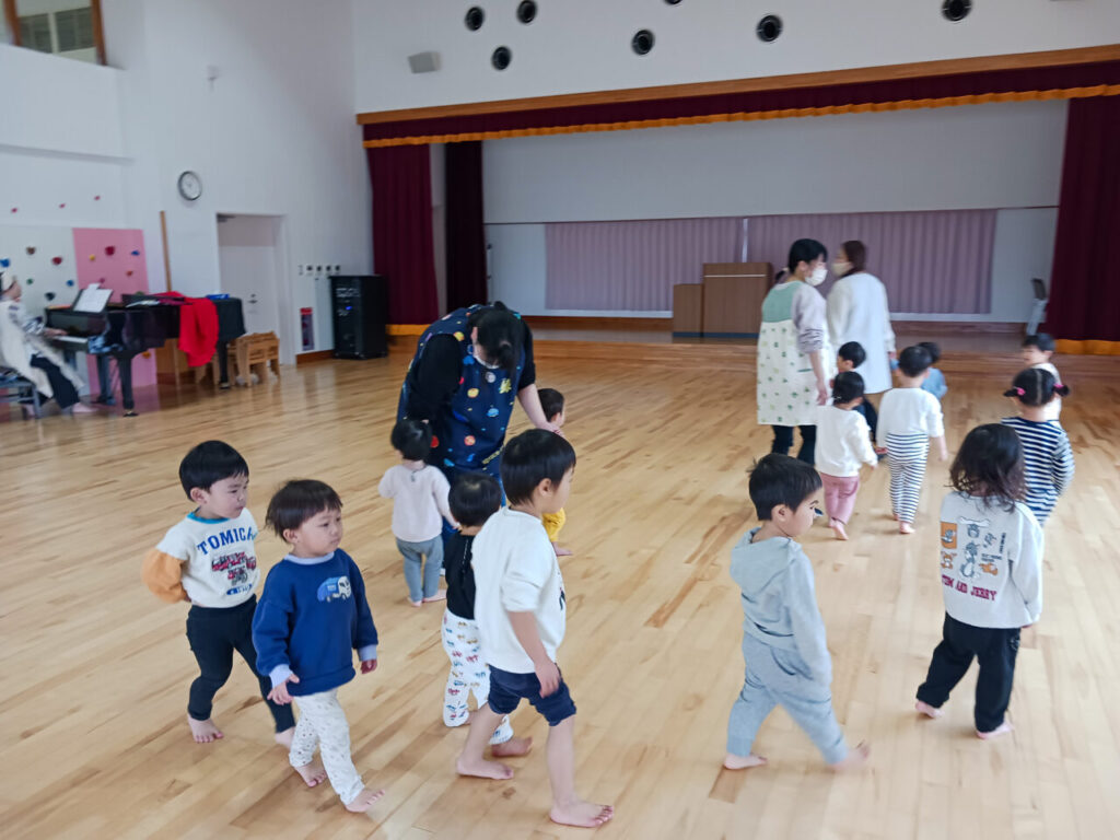前半はちゅうりっぷ組(2歳児)、たんぽぽ組(1歳児)の子どもたちがピアノの音色に合わせて、動物になりきってお散歩をしました。