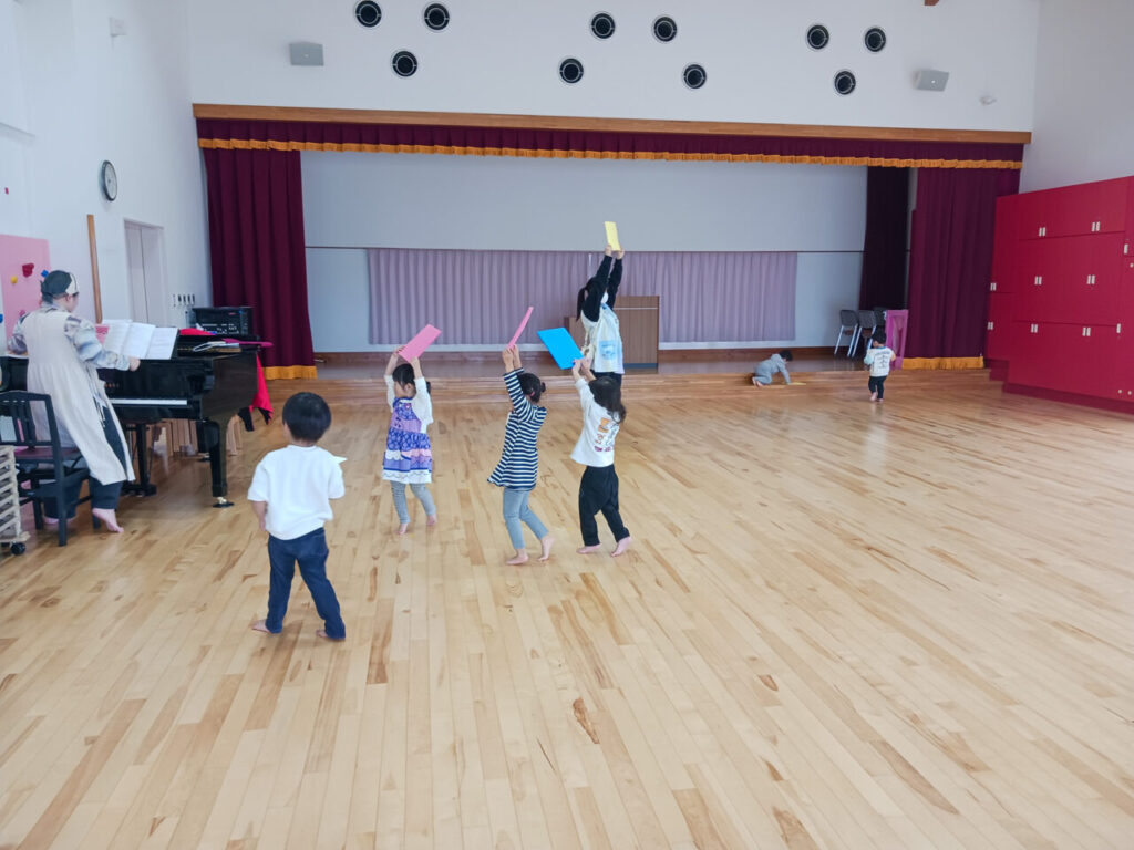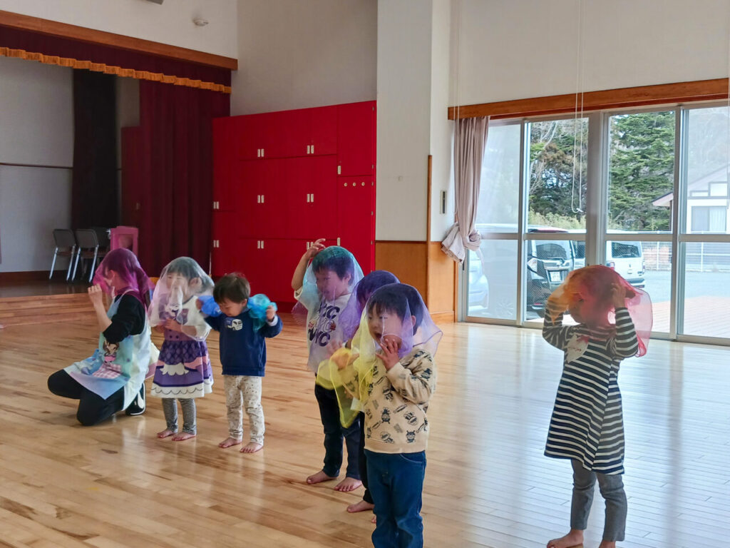 後半はちゅうりっぷ組が、オーガンジーやフラフープ、4色ボードを使って体を動かしていました。 子どもたちは様々な動きをして表現する楽しさを感じていました。
