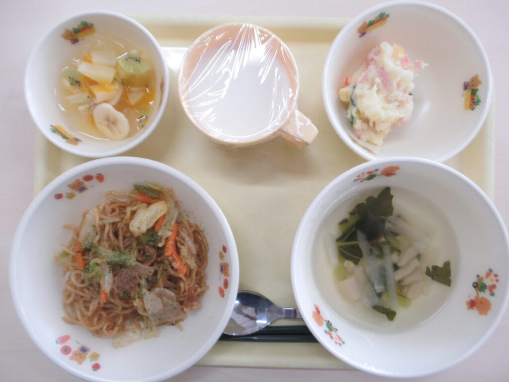 焼きそば ポテトサラダ コンソメスープ 牛乳 フルーツポンチ