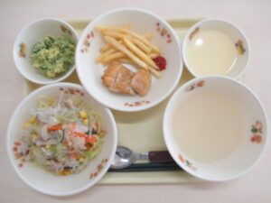 ひまわりぐみリクエストメニュー 塩ラーメン タンドリーチキン フライドポテト ミモザサラダ プリン