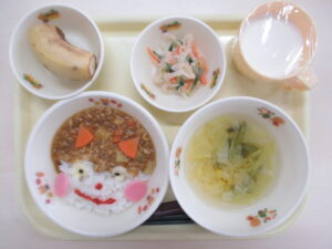 ごはん 鬼のキーマカレー 大根サラダ 野菜スープ バナナ 牛乳
