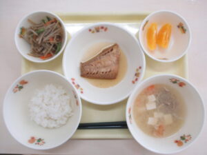 ごはん 煮魚 きんぴらごぼう 豚汁 オレンジ