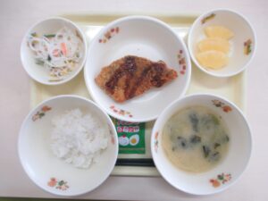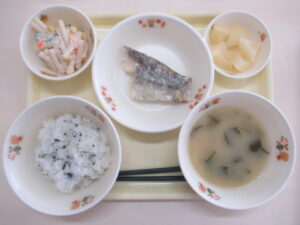 わかめごはん たらのムニエル マカロニサラダ みそ汁 白桃缶