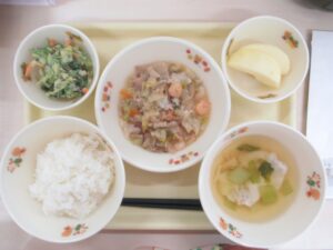 ごはん 中華丼 胡麻マヨネーズ和え ワンタンスープ りんご