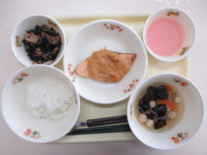 ごはん 鮭のねぎみそ焼き ひじきの煮物 こづゆ フルーツゼリー