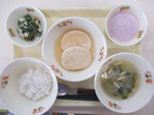 ごはん 豆腐ハンバーグ ごま和え みそ汁 フルーチェ